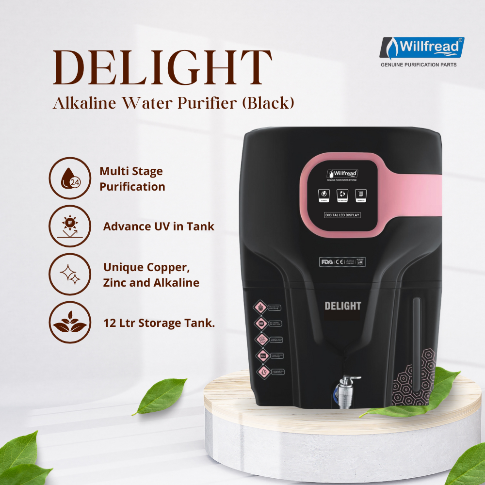 Introducing the WILLFREAD Delight Series Alkaline RO Water Purifier – a perfect blend of performance, style, and health. Designed with a stunning black and pink body, this purifier not only enhances your kitchen décor but also ensures pure, safe, and mineral-rich drinking water. Equipped with advanced RO+UV+UF+TDS control technology, it effectively removes impurities, viruses, and bacteria, while the alkaline filter balances pH and adds essential minerals. Ideal for domestic use, it comes with a 2-year warranty for complete peace of mind.